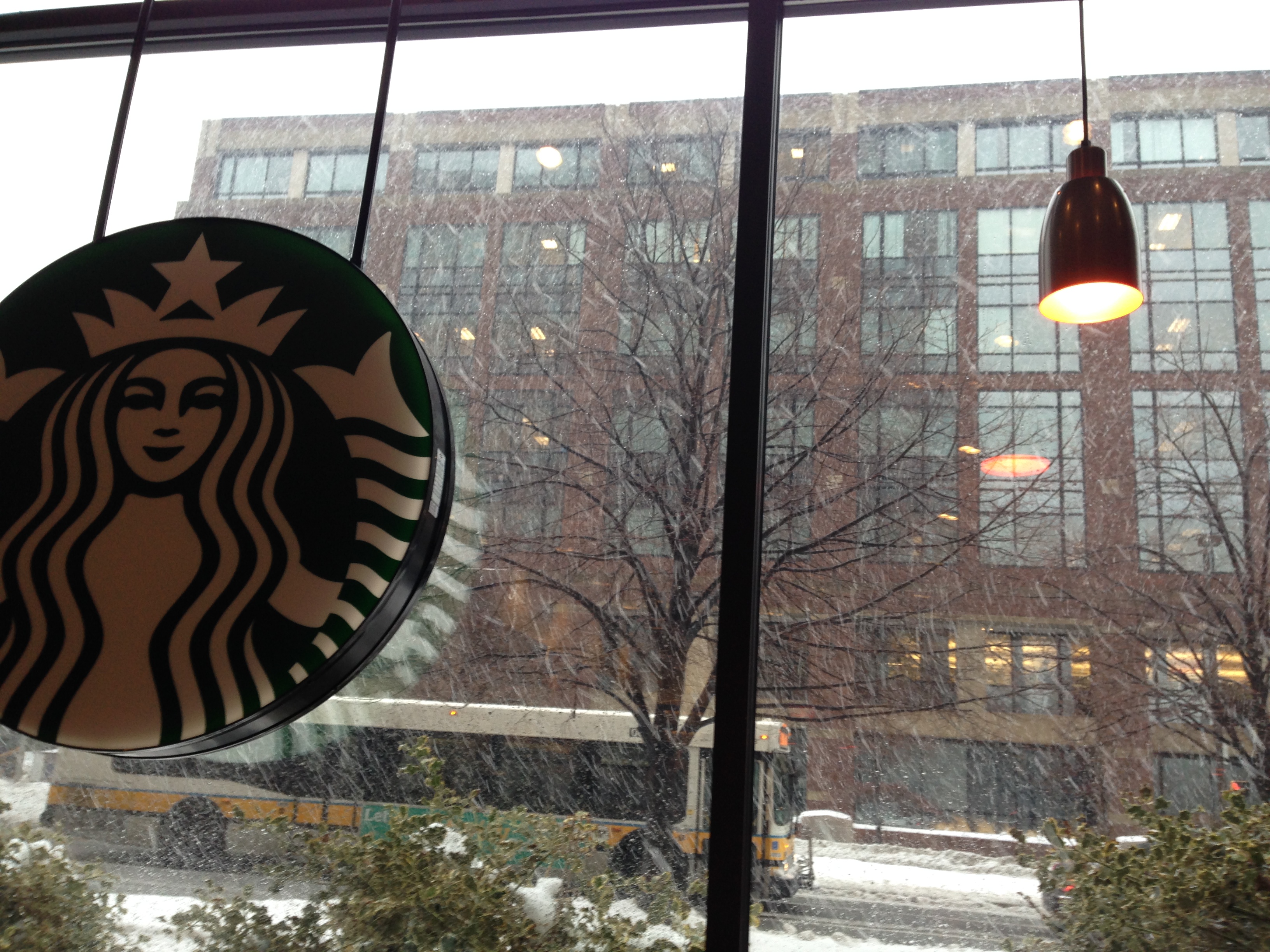 Caffelatteliv i snøvær. Forresten ingen amerikanske damer med barnevogn som ville finne på å gå ut døra om det snør. Jeg derimot…