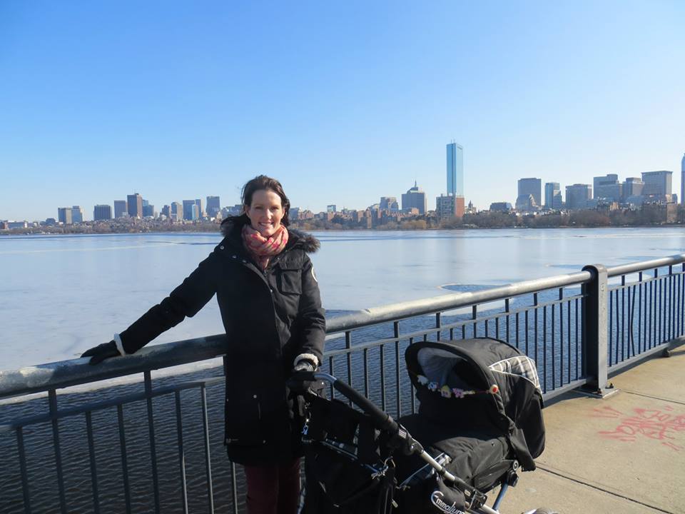 Blid norsk dame med svensk vogn (som alle kommenterer at er GEDIGEN) på trilletur i Boston. Barnevogner setter man IKKE fra seg utenfor kafeen med baby oppi, slikt kan man bli anmeldt for.