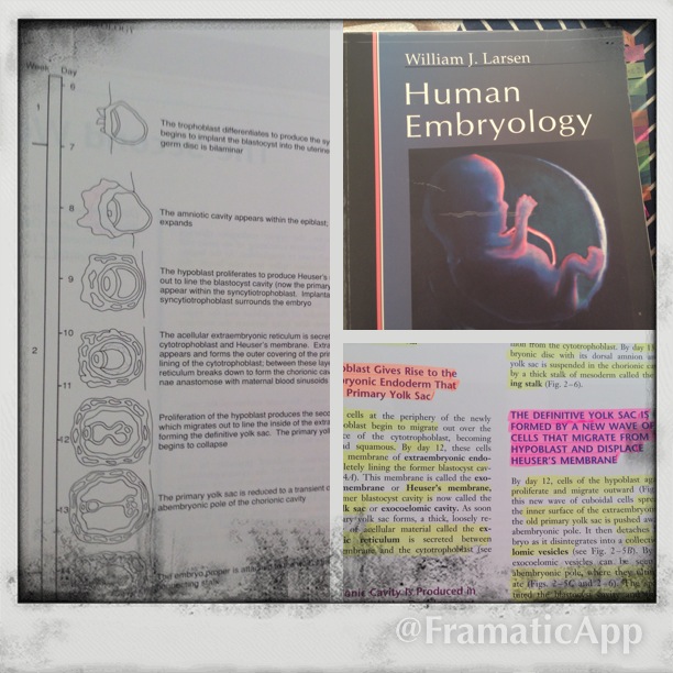 Noen av dere har kanskje merket at det er lenge siden forrige uke-innlegg, sammensatte årsaker til dette, men det skyldes delvis at jeg har manglet inspirasjon. I den anledning fant jeg frem min gamle embryologibok fra de hine hårde studentdager. Oi ve. Jeg begynte å lese litt i den da jeg var gravid selv, men la den fort fra meg da jeg fort kom på hvor sykdomsfokusert den var. Det er noen gufne bilder av misdannelser der, for å si det sånn. Nå er jeg ikke like skjør lenger, så fikk bladd litt i den i dag. Har ikke funnet snev av noe som kunne inspirere meg til å skrive noe fantasifullt om uke 26, men jeg registrerer at den er godt lest. Ekstremt mye guling, og et slags fargerikt system med både tusjing og lapper i sjokkfarger. Var jeg virkelig så grådig interessert i akkurat dette? Jeg har for eksempel gulet ut denne viktige setningen i sin helhet (vi befinner oss nå ca 4 uker etter befruktning): «Seven cervical vertebrae form from eight cervical somites because the cranial half of the first cervical sclerotome fuses with the caudal half of the fourth occipital sclerotome and contributes to the formation of the base of the skull»