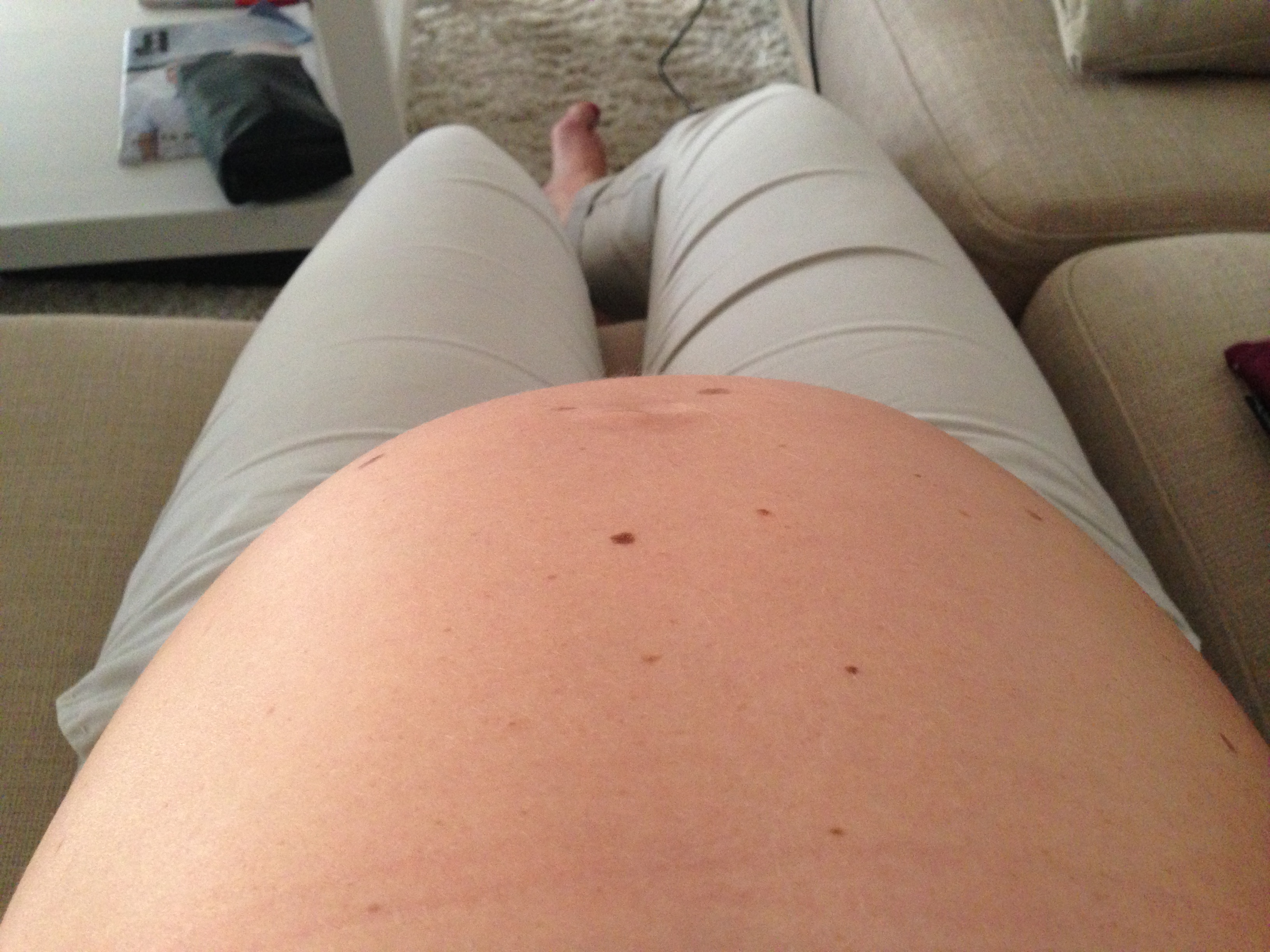 Jeg trodde jeg brydde meg mye mindre om kropp enn det jeg faktisk gjør, men faktum er at det er først nå jeg begynner å bli kroppsfokusert. Jeg griper meg selv i å sammenligne mager med alle de andre gravide jeg plutselig oppdager rundt meg. Kroppen min endrer seg. Klærne passer ikke. Og alt det plager meg. Og det irriterer meg at det plager meg, hvis du skjønner. Jeg vil virkelig ikke være en sånn dame som blir manisk over kropp, og jeg synes det er leit at graviditeten delvis har utløst denne manien. Heldigvis har jeg noen måneder å jobbe meg ut av den. Det som derimot er helt fremmed er ønsket om en TYNN unge. Jeg ønsker meg en frisk unge, og jeg håper den suger til seg all den næring den trenger. Babyer skal være lubne, med smilehull på albuer og knær! 🙂
