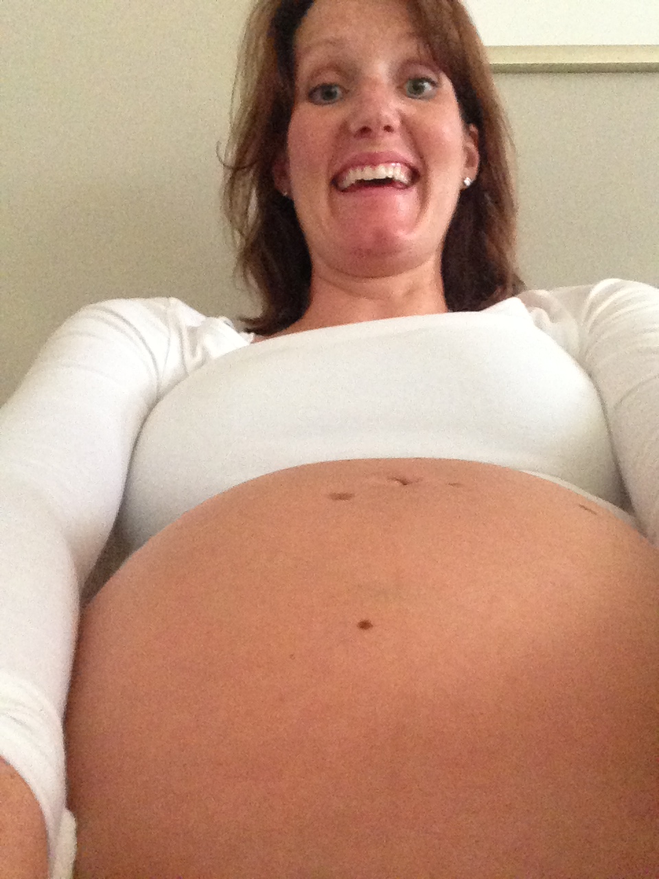 Når det gjelder profilbilde syns jeg jo egentlig at jeg burde ha et bilde av meg selv som gravid. Men jeg har virkelig veldig få festlige bilder fra den tiden – dette galskapsbildet her er vel det eneste som ikke er sånn teit «holde-seg-rundt-magen-og-smil-lykkelig-og-fårete»-bilde. Og ærlig talt – jeg er for forfengelig til å bruke det. Haha, jeg ser jo klin gæren ut! Her tar jeg altså et selfie fra en særdeles lite latterende vinkel, langt på overtid, kvelden før jeg skal inn på sykehuset for induksjon. Gira, lettet, veldig klar, absolutt ikke klar, tilnærmet psykotisk av angst, frykt, lykke, glede, søvnmangel og utslitthet – og det til og med før kaoset har begynt på ordentlig: