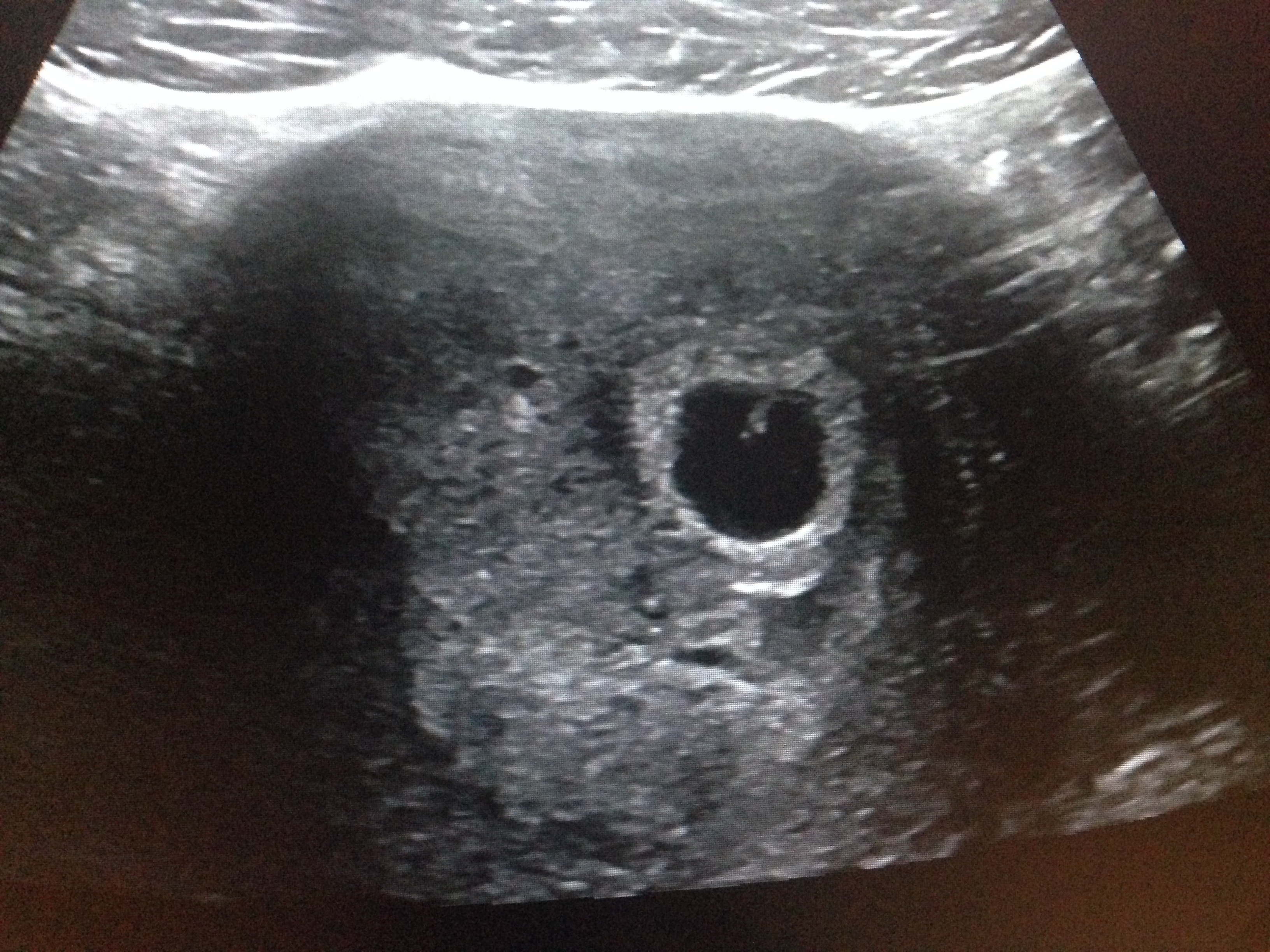 Og dere – jeg har faktisk smugkikket på lille allerede! Haha, jeg trodde ikke det var mulig å se noe som helst på utvendig ultralyd allerede i uke 6, men tror du ikke jeg fikk det til likevel. La meg presentere – lille bølle! Uke 6 + 2. Bildet er tatt av mor selv, magen måtte trekkes litt inn og ultralydproben moses godt ned i vevet, men jeg fikk et finfint bilde, selv om jeg ikke riktig kunne se noe sikkert hjerte så ser det sånn passelig ut med tanke på hvor lang jeg er på vei. Jubel!